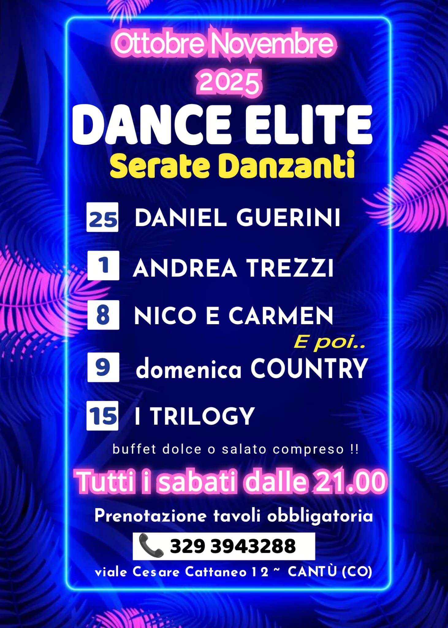 Le serate danzanti di Dance Élite sono un'occasione unica per vivere la passione per il ballo in un ambiente accogliente, vivace e inclusivo. Aperte a tutti – allievi, amici e appassionati – queste serate offrono un mix di divertimento, musica e socialità. Dai ritmi latini alla musica da sala, dalle coreografie di gruppo al boogie woogie, ogni evento è pensato per coinvolgere e far ballare chiunque, a prescindere dal livello. Il nostro staff anima la pista con entusiasmo e professionalità, creando un’atmosfera energica e rilassata allo stesso tempo. È il modo perfetto per mettere in pratica quanto appreso durante i corsi, conoscere nuove persone e condividere la gioia della danza anche fuori dall’orario delle lezioni.